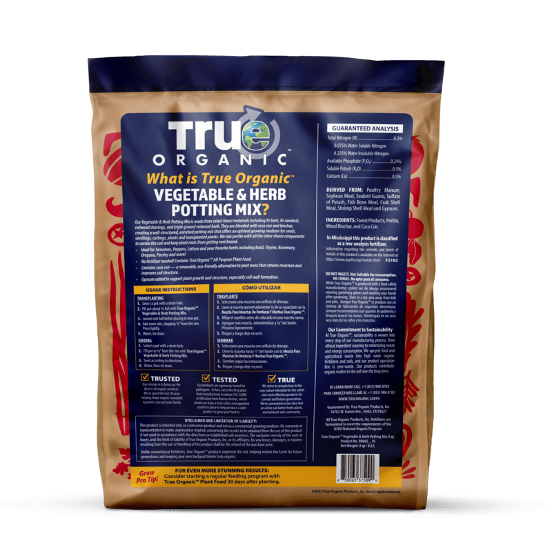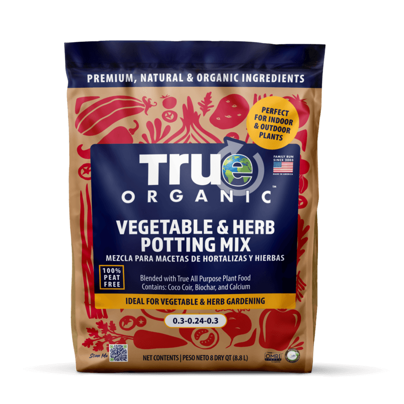While you can use regular potting soil for vegetables, a potting mix specifically formulated for edible plants will produce better results. True Organic® Vegetable & Herb Potting Mix is optimized with the nutrient profile that vegetables and herbs need for productive growth, and it’s OMRI Listed® so you know it’s safe for growing food.
