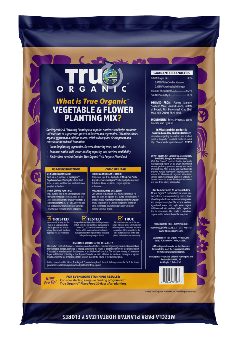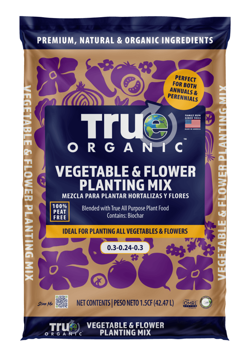 True Organic® Vegetable & Flower Planting Mix is designed for in-ground planting and raised bed use. It’s the perfect soil mix for building productive vegetable gardens and colorful flower beds.